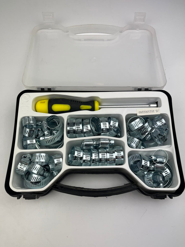 Schlauchschellen Sortimentskasten 50 teilig mit Schlauchschellen in verschiedenen Größen.